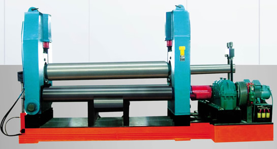 本機結構型式為三輥對稱式,上輥在兩下輥中央對稱位置作垂直升降運動,通過液壓缸內的液壓油作用于活塞而獲得,為液壓傳動;兩下輥作旋轉運動
